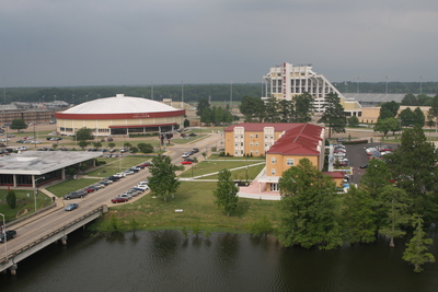 Photo taken from the library. Schulze Dining Hall, Fant-Ewing Coliseum, Malone Stadium, and Olin Dorm (Vines Hall) are included in the photo.