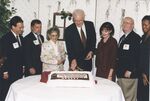 Unveiling ceremony for Northeast Louisiana University name change to University of Louisiana Monroe. Lawson Swearingen and Kitty Degree are pictured standing behind the cake.