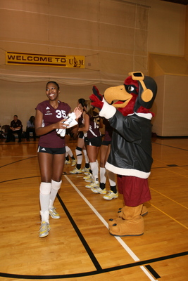 Women's volleyball game vs. Northwestern State University. Jersey numbers included in the photo: 15 and 35. ULM's mascot Ace is included in the photo.
